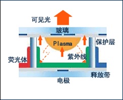 等离子(PDP)是一种利用气体放电的显示技术,其工作原理与日光灯很相似。它采用了等离子管作为发光元件,屏幕上每一个等离子管对应一 个像素,屏幕以玻璃作为基板,基板间隔一定距离,四周经气密性封接形成一个个放电空间。放电空间内充入氖、氙等混合惰性气体作为工作媒质。在两块玻璃基板 的内侧面上涂有金属氧化物导电薄膜作激励电极。当向电极上加入电压,放电空间内的混合气体便发生等离子体放电现象。气体等离子体放电产生紫外线,紫外线激 发荧光屏,荧光屏发射出可见光,显现出图像。当使用涂有三原色(也称三基色)荧光粉的荧光屏时,紫外线激发荧光屏,荧光屏发出的光则呈红、绿、蓝三原色。 当每一原色单元实现256级灰度后再进行混色,便实现彩色显示。等离子体显示器技术按其工作方式可分为电极与气体直接接触的直流型PDP和电极上覆盖介质 层的交流型PDP两大类。目前研究开发的彩色PDP的类型主要有三种:单基板式(又称表面放电式)交流PDP、双式(又称对向放电式)交流PDP和脉冲存 储直流PDP。